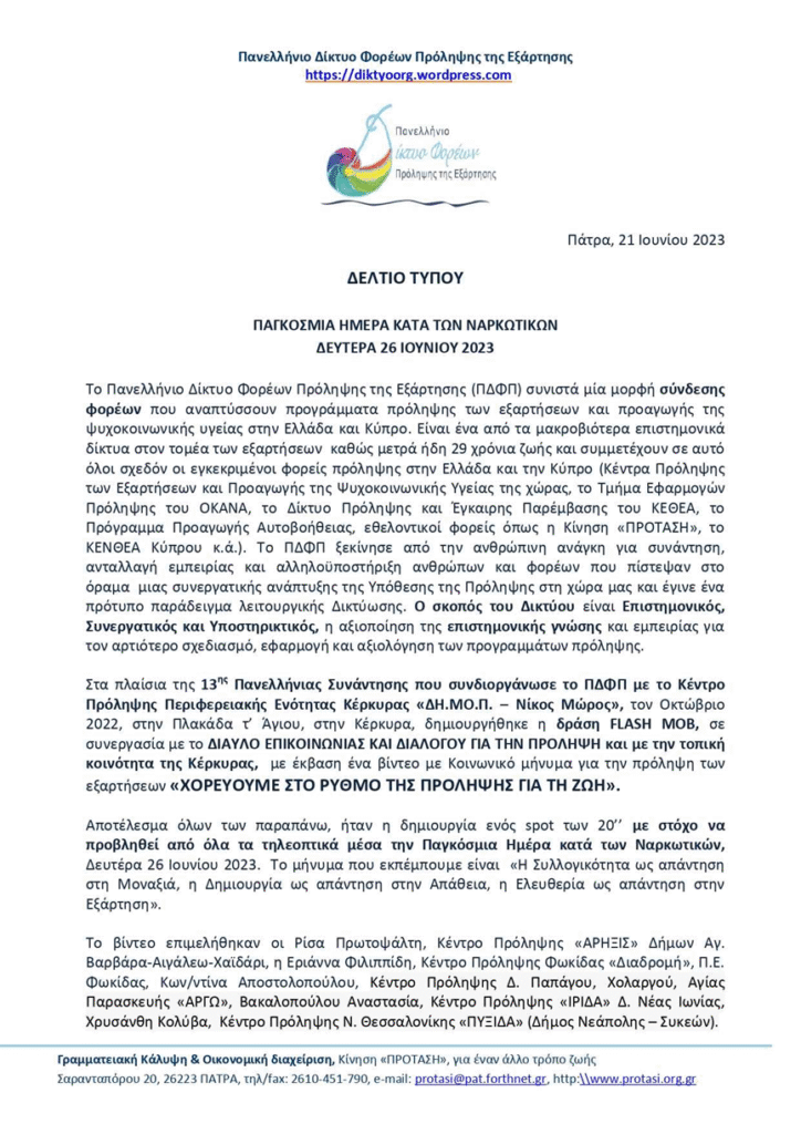ΠΑΓΚΟΣΜΙΑ ΗΜΕΡΑ ΚΑΤΑ ΤΩΝ ΝΑΡΚΩΤΙΚΩΝ 26 ΙΟΥΝΙΟΥ 2023_ ΠΑΝΕΛΛΗΝΙΟ ΔΙΚΤΥΟ ΦΟΡΕΩΝ ΠΡΟΛΗΨΗΣ ΤΗΣ ΕΞΑΡΤΗΣΗΣ