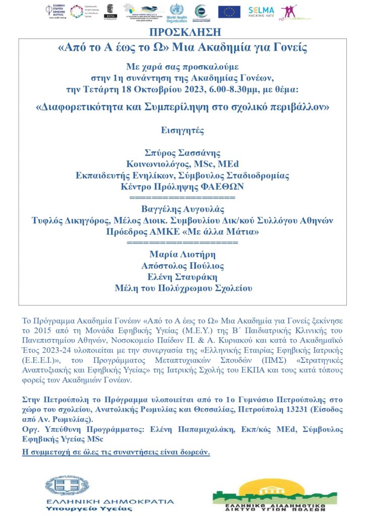 1ο Γυμνάσιο Πετρούπολης_ “Από το Α έως το Ω” Μία Ακαδημία για Γονείς_ “Διαφορετικότητα και Συμπερίληψη στο σχολικό περιβάλλον” Τετάρτη 18 Οκτωβρίου 2023 στις 18:00