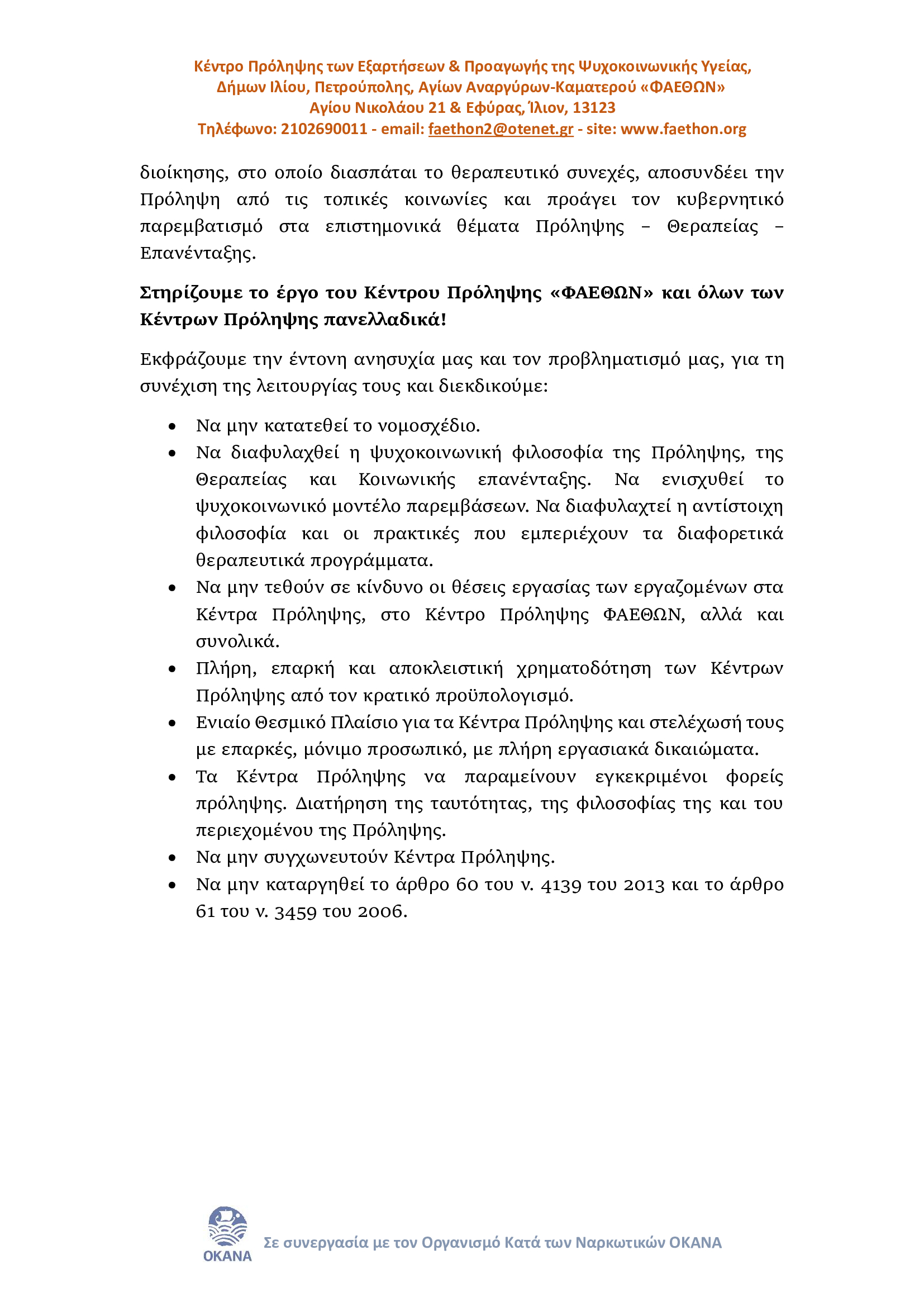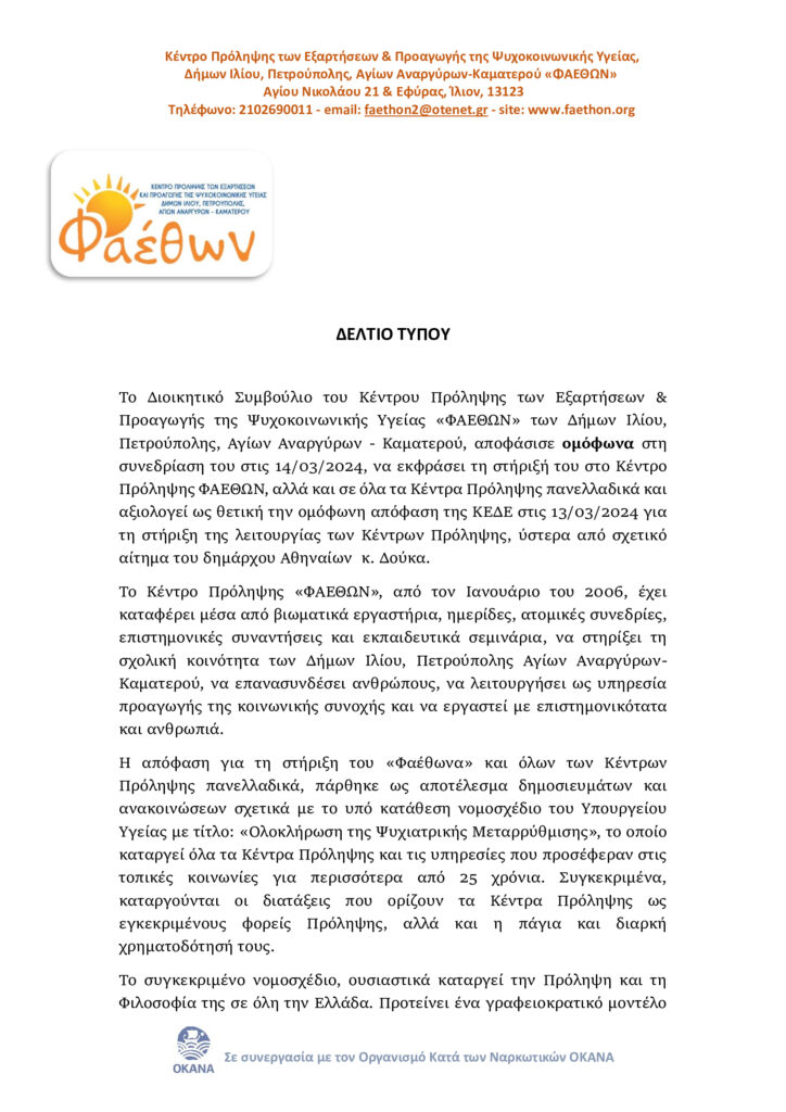 ΔΕΛΤΙΟ ΤΥΠΟΥ ΣΤΗΡΙΞΗ ΣΤΟ ΚΕΝΤΡΟ ΠΡΟΛΗΨΗΣ “ΦΑΕΘΩΝ”_ ΣΤΗΡΙΞΗ ΣΕ ΟΛΑ ΤΑ ΚΕΝΤΡΑ ΠΡΟΛΗΨΗΣ ΠΑΝΕΛΛΑΔΙΚΑ