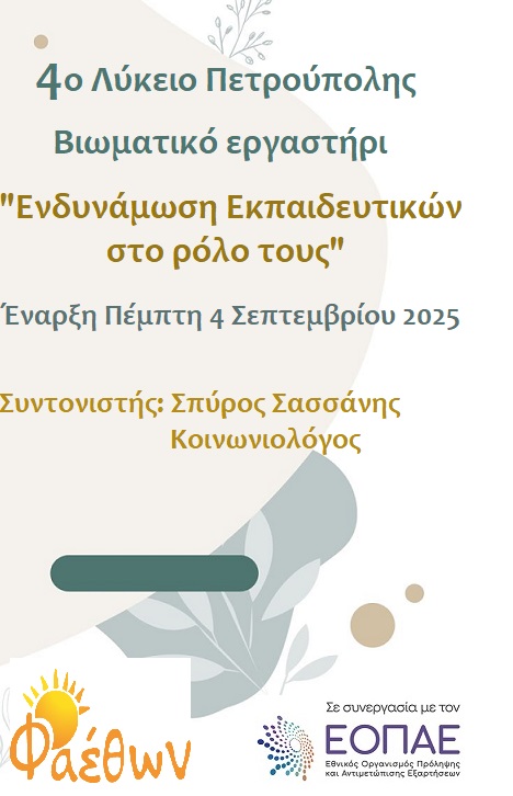 4ο Λύκειο Πετρούπολης_ Βιωματικό Εργαστήρι Εκπαιδευτικών_ “Ενδυνάμωση Εκπαιδευτικών στο ρόλο τους”_ Έναρξη 4 Σεπτεμβρίου 2025